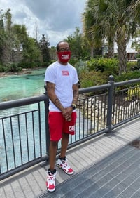 (Gildan) short sleeve White Tee, Red Box, & White Lettering